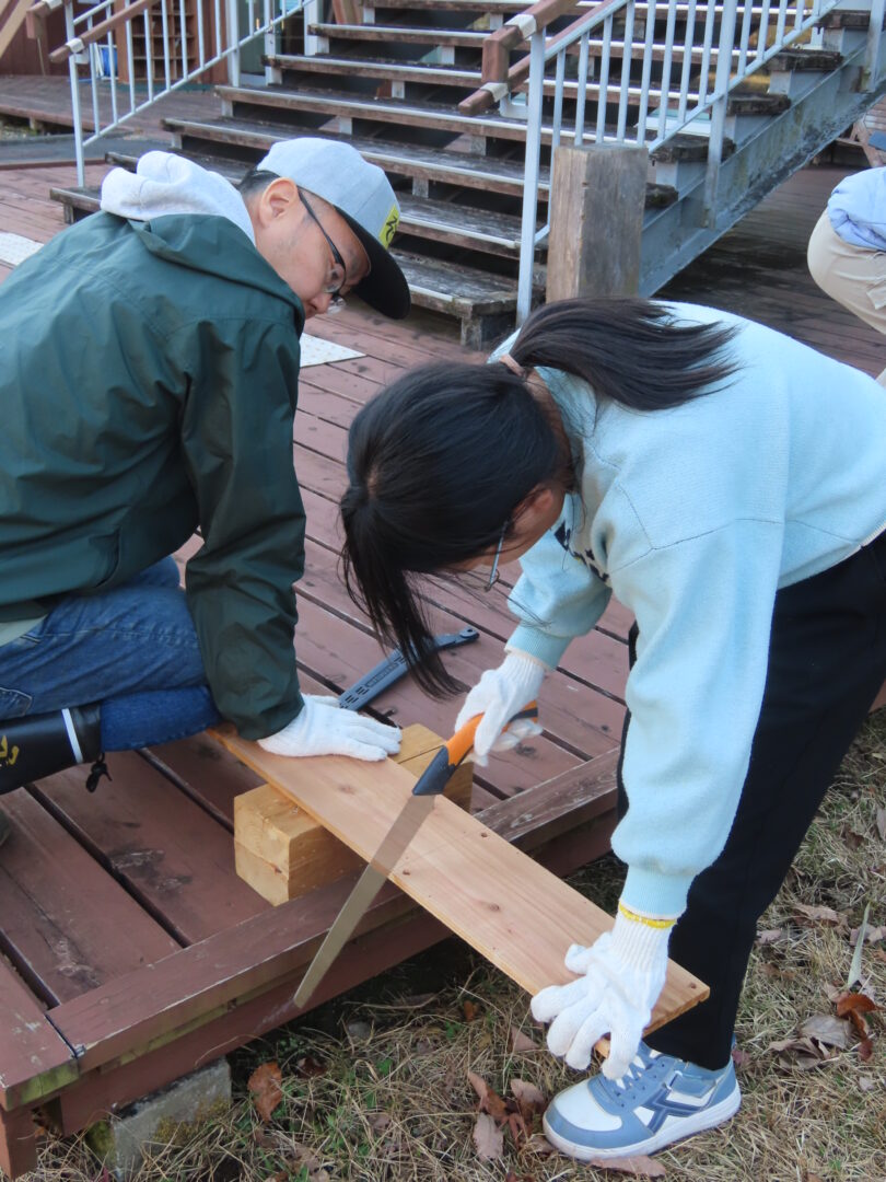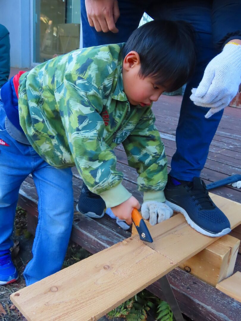 木をのこぎりで切るところからスタート。子どもたちが一生懸命切ってくれました。